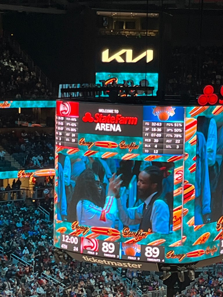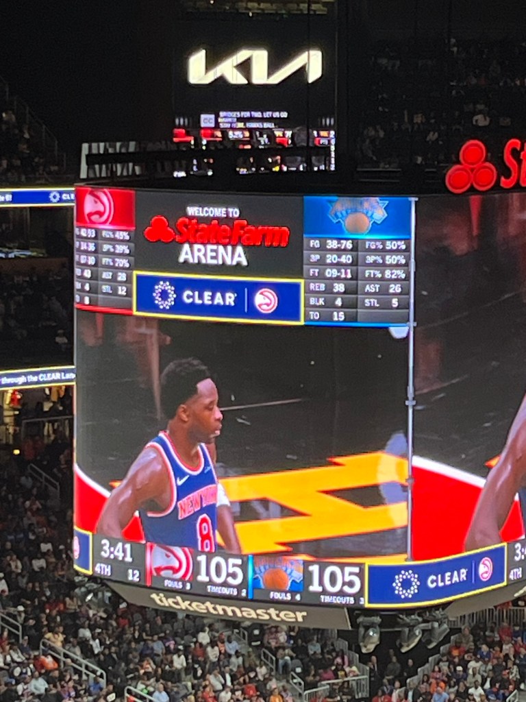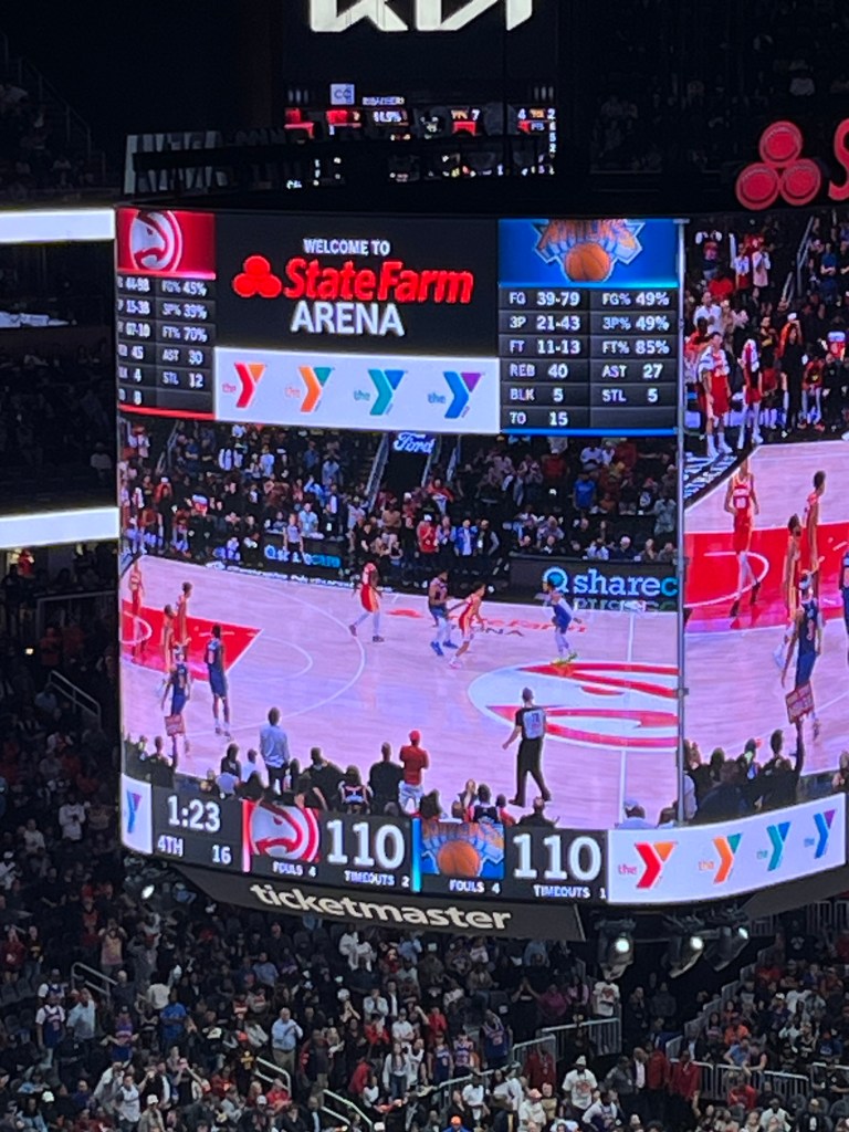Yesterday we flew from New York to Atlanta and went to our first NBA game: Atlanta Hawks vs NY Knicks. I am not really into sports, but both {M} and {J} are, with {J} being a huge basketball fan. He follows the whole season and stays up at night to watch the games live and so we couldn’t skip going to a game while here in the States. The fun started when we arrived early and stood in line, together with both Hawks and Knicks fans. There was joking and cheering back and forth and all in good fun, which I just can’t imagine happening at a soccer game with say Feyenoord playing against Ajax. When we found our seats way up in the stands we were surprised at how well we could see the court and the people on the court. And again in the stands the fans were all mingled and friendly with each other.
